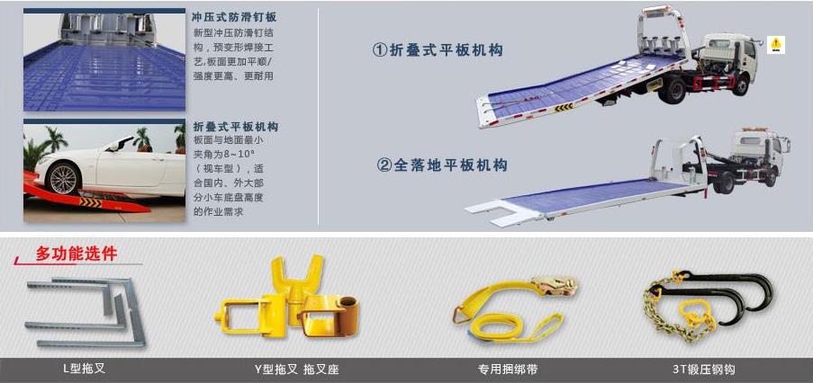 上装配置:4吨上装,4吨卷扬,21米钢丝绳,3吨后拖臂,底板为花纹一体板(可选冲压板),板长5.6米,双侧联动操作,配四根捆绑带,**小车一套,L型抱胎架一对,工具箱一个,LED工作照明灯一对,其余标配,整车尺寸:7550×2350×2570mm。